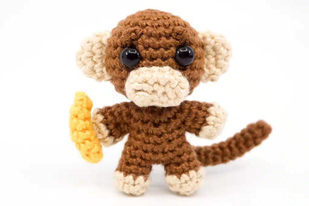 Der hier abgebildete Amigurumi Affe wurde mit der „Schachenmayr Catania“ und einer 2,5 mm Häkelnadel gehäkelt und hat eine Höhe von 5,5 cm.