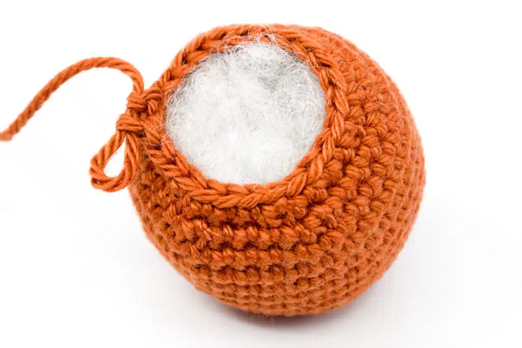 Häkeln Sie nun zur letzten Runde und stopfen Sie den letzten Bereich ebenfalls prall, bevor Sie die Öffnung schließen.