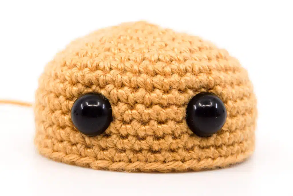 Häkeln Sie immer einige Runden mehr nach der Runde, in der die Augen angebracht werden sollen, da die angebrachten Augen ansonsten die Maschen in die Sie häkeln müssen überdecken könnten.