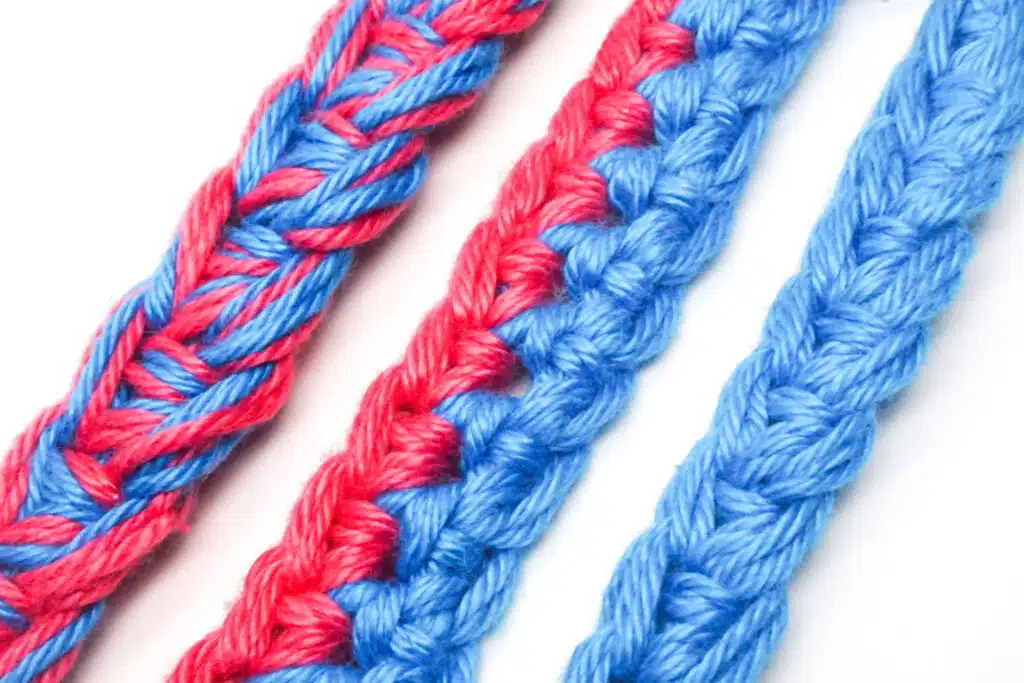 Der Farbwechsel funktioniert beim häkeln mit mehreren Fäden genauso wie beim häkeln mit einfädigen Garn. Sie müssen dafür das neue andersfarbige Garn genauso vorbereiten wie das Garn das Sie aktuell verwenden.