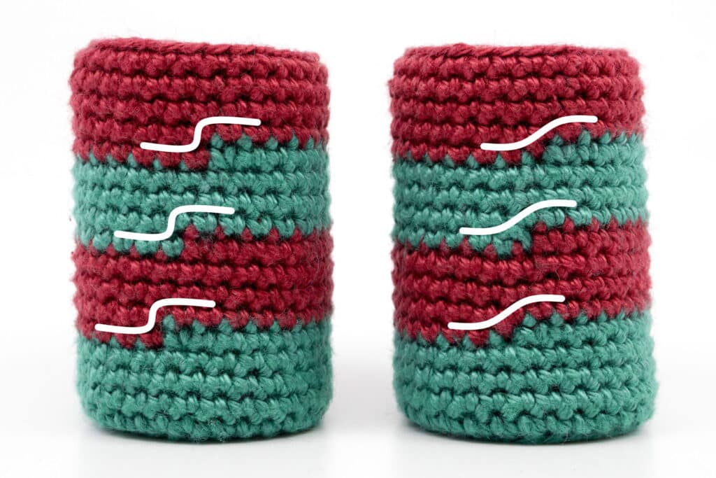 Abschließend noch der Vergleich zwischen einem Farbwechsel bei dem Sie mit einer Kettmasche weiterhäkeln und einem Farbwechsel bei dem Sie mit einer festen Masche weiterhäkeln.