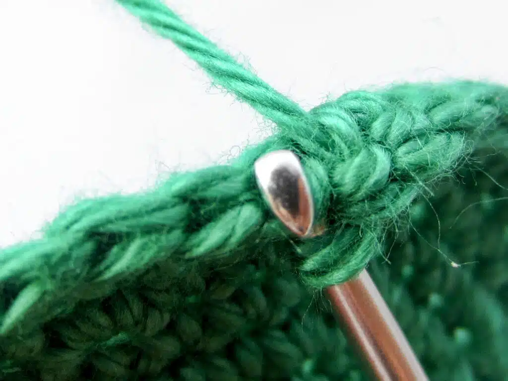 - 1. Schritt: Anstatt durch die komplette Masche zu stechen wie es bei der normalen Abnahme der Fall ist, stechen Sie mit Ihrer Häkelnadel NUR durch das vordere Maschenglied der nächsten Masche, sodass die Häkelnadel zwischen den beiden Maschengliedern austritt. Sie haben 2 Schlaufen auf der Häkelnadel.