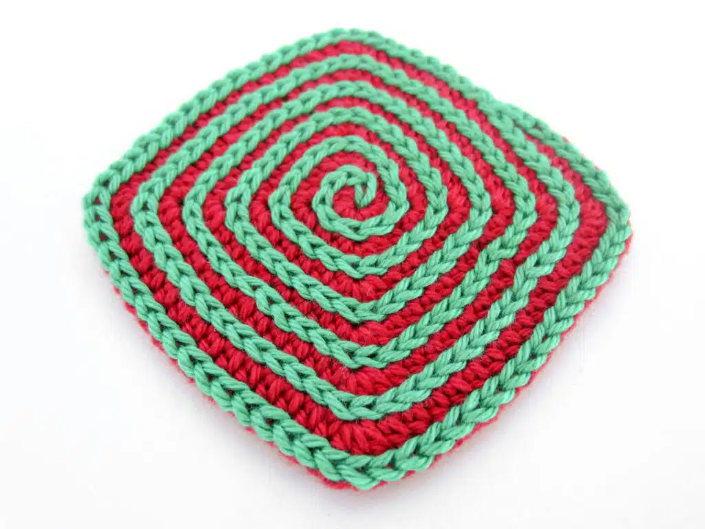 - Den Untersetzer in Weinrot in Spiralrunden häkeln.