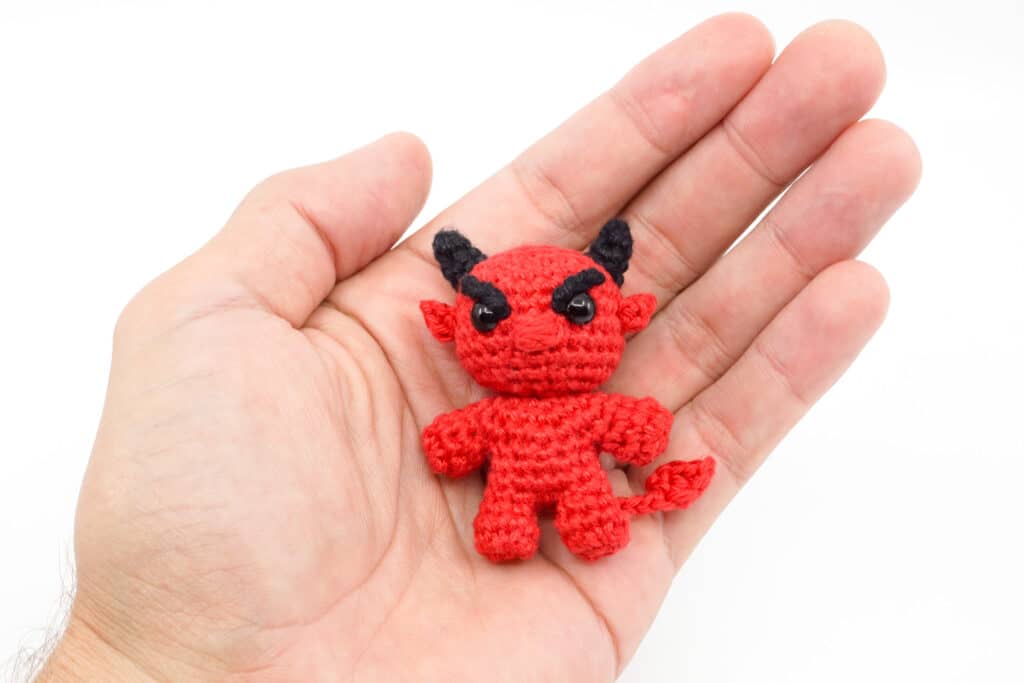 Der hier abgebildete Amigurumi Teufel wurde mit der „Schachenmayr Catania“ und einer 2,5 mm Häkelnadel gehäkelt und hat eine Höhe von 5,5 cm.