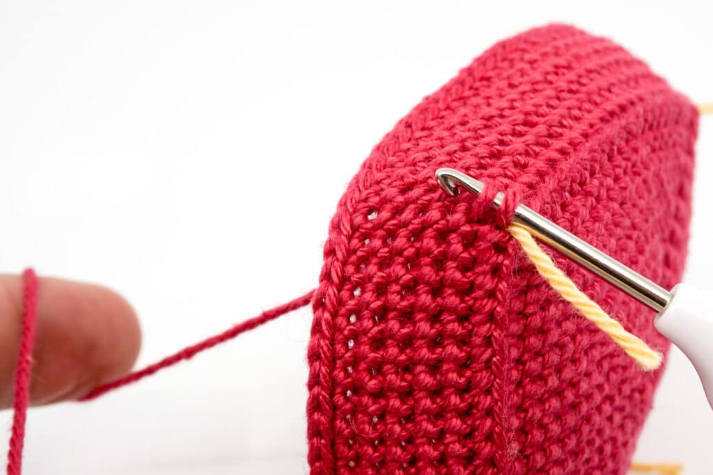 Kettmaschen aufhäkeln: Stechen Sie nun die Häkelnadel von außen nach innen durch die Masche durch die einer der Markierungfäden durchgezogen wurde. Nehmen Sie auf der Innenseite das Erdbeer farbenene Garn auf und ziehen dieses durch die durchgestochene Masche. Sie haben eine Schlaufe auf der Häkelnadel.