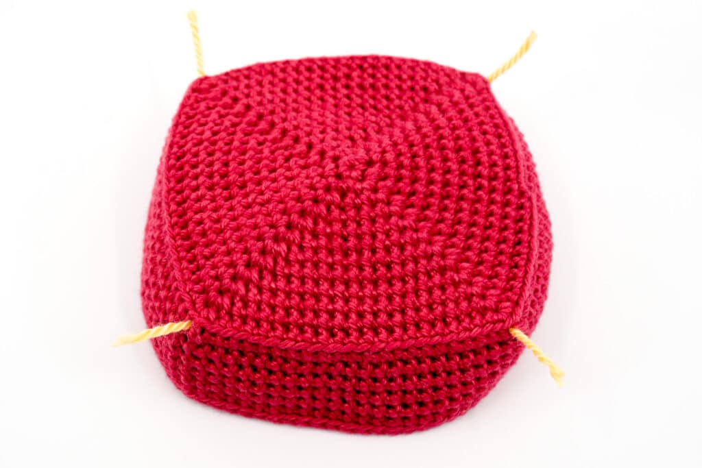 Position der Ecken bestimmen: Um die Geschenkboxen eckiger wirken zu lassen, häkeln Sie an allen vier Ecken Kettmaschen auf. Bevor diese jedoch aufgehäkelt werden, müssen die Ecken bestimmt werden.
